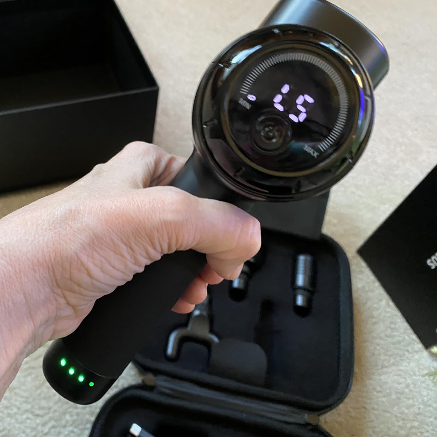 Elige uno de los 5 niveles de velocidad (1800 rpm para recuperación ligera, 2100 rpm para relajación activa, 2400 rpm para mantenimiento muscular, 2700 rpm para descarga profunda o 3000 rpm para terapia de alto impacto) y disfruta de hasta 22 kg de presión constante: un rendimiento potente y estable que descontractura y reactiva la musculatura en profundidad.